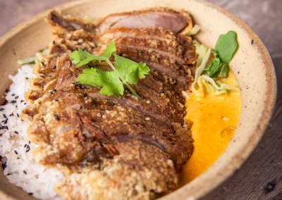 Probiere unsere Pagoda Pho, Buddha’s Bowl oder Mango no Hana Roll, wenn du pflanzlich essen möchtest.